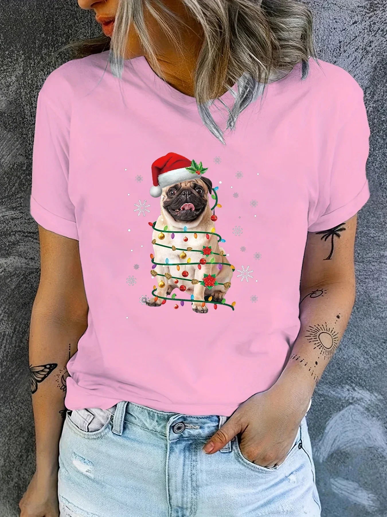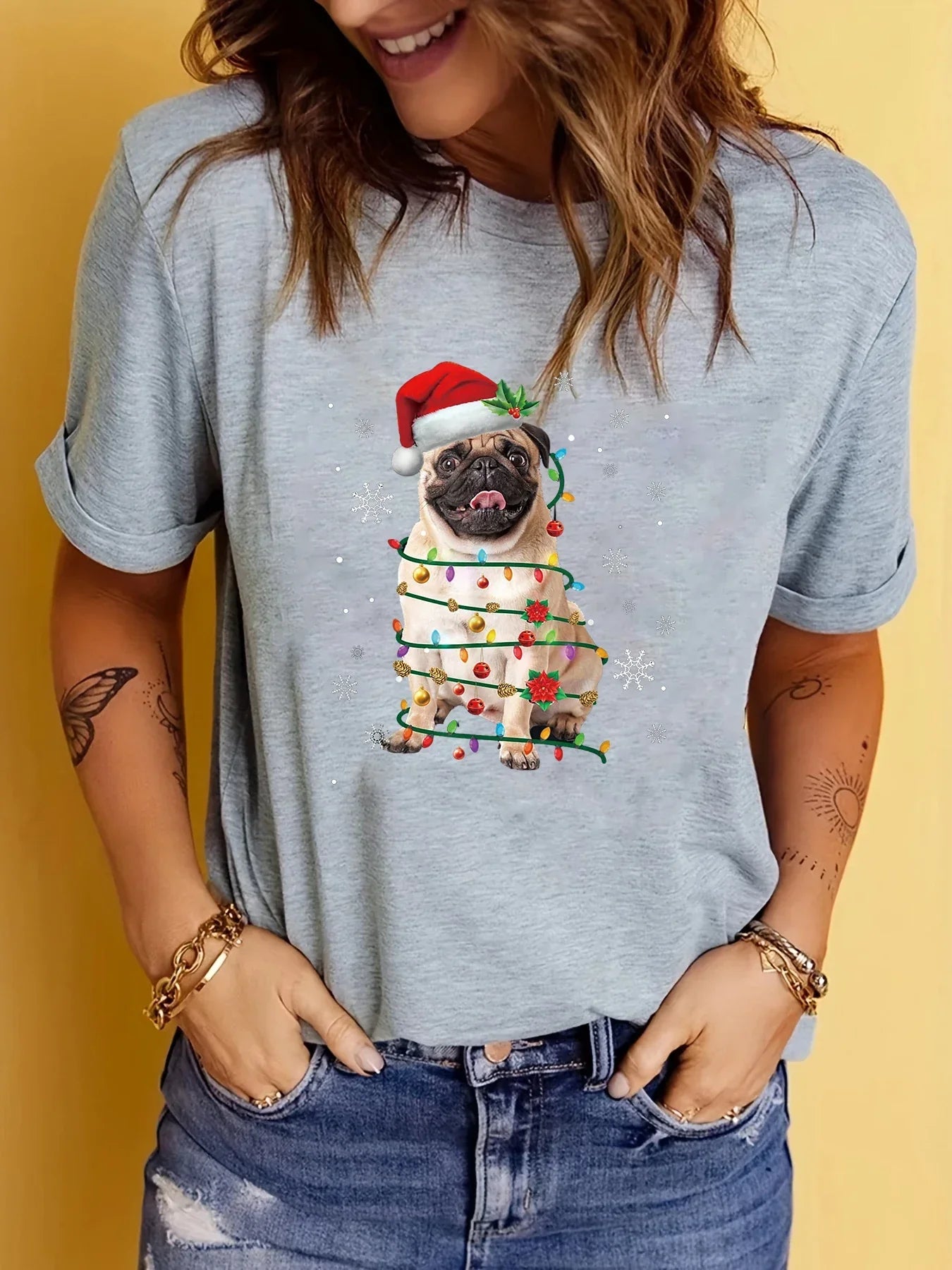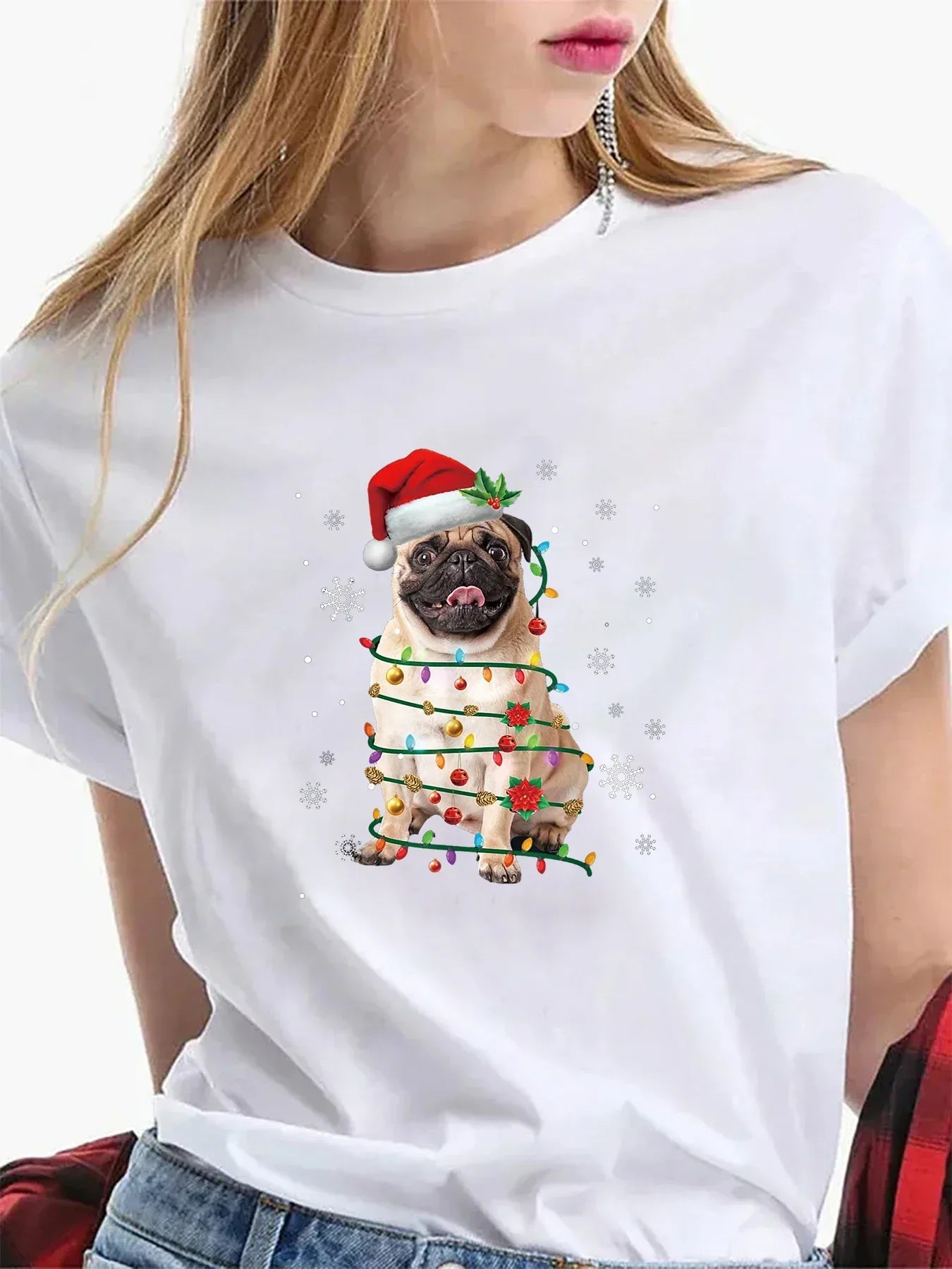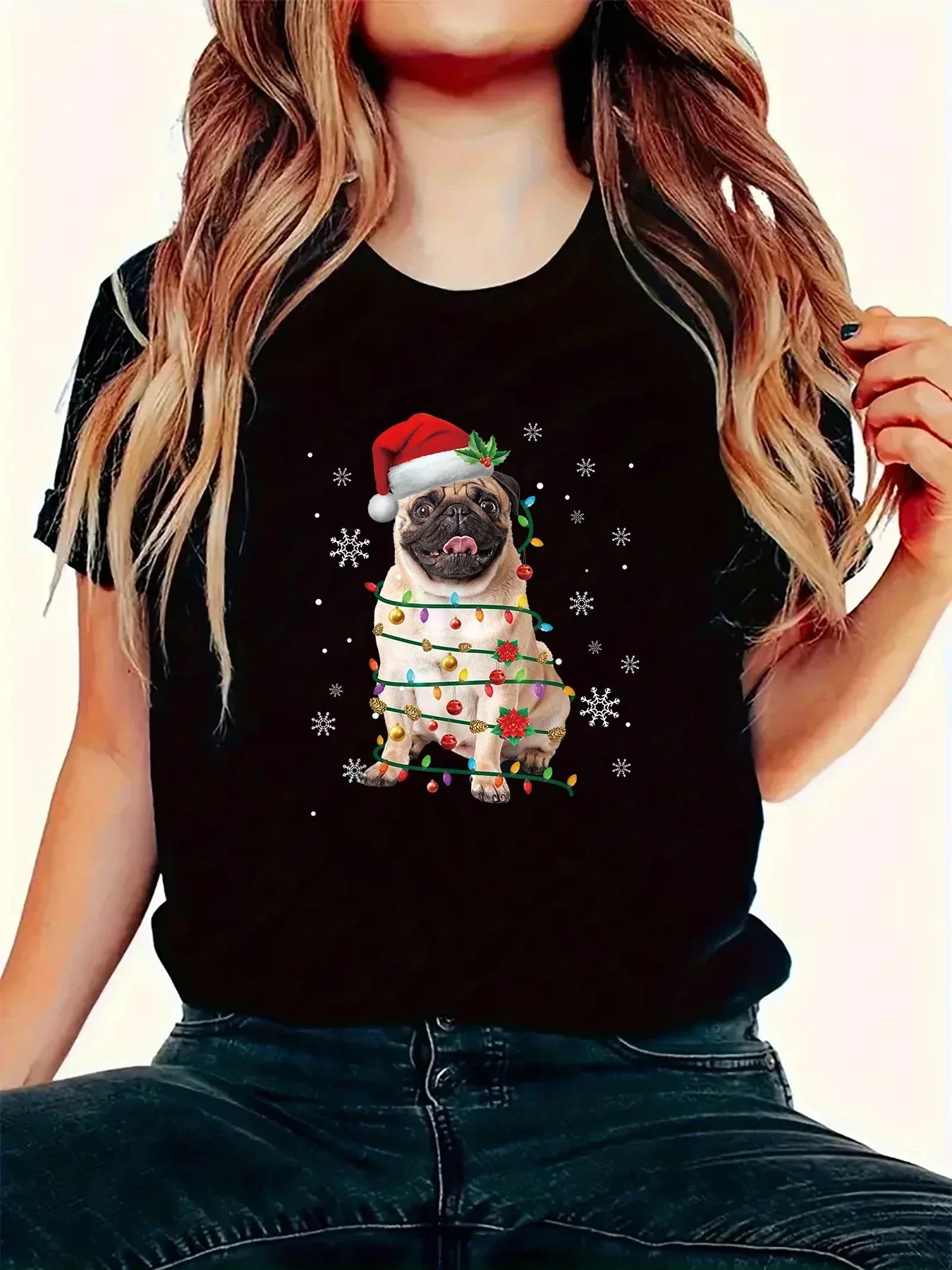 Women's Christmas Santa Pug Tree Light Printed T-Shirt - PK-501286 / S is backordered and will ship as soon as it is back in stock.