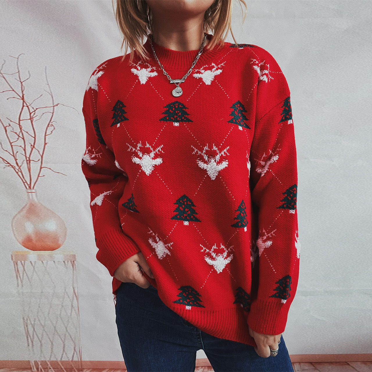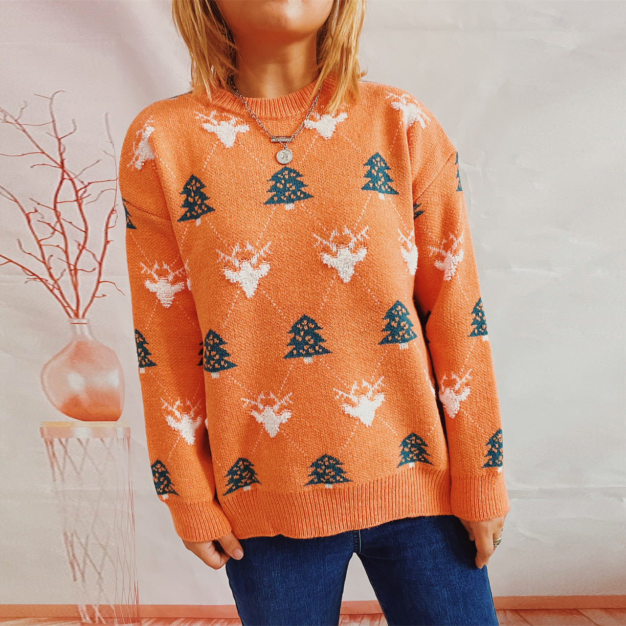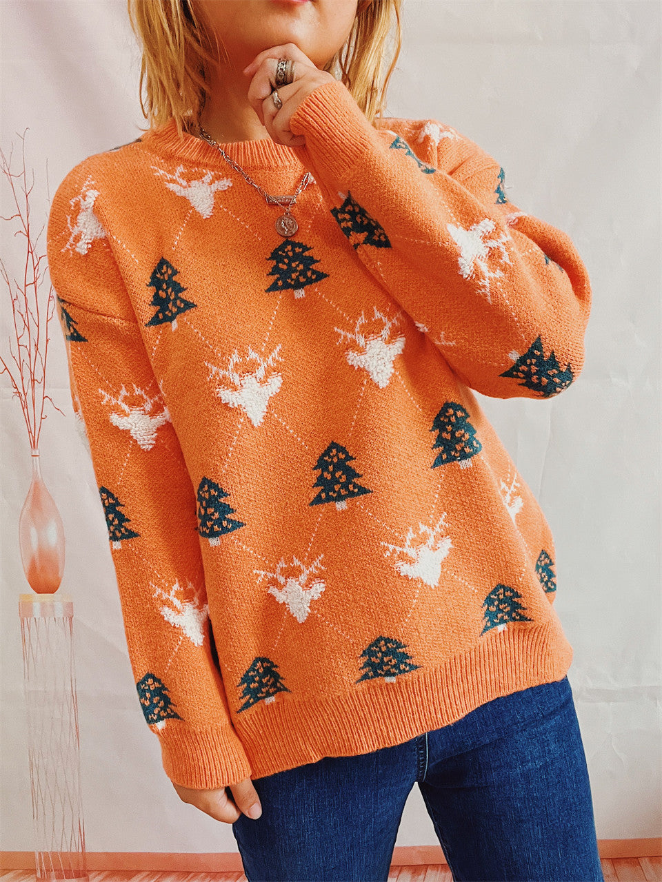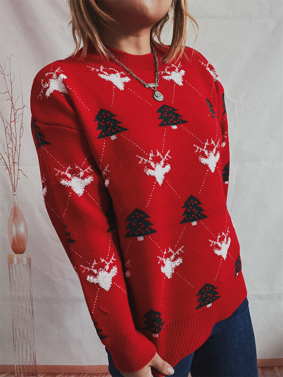 Women's Round Neck Long Sleeve Loose Elk Jacquard Christmas Sweater - Color 1 / L is backordered and will ship as soon as it is back in stock.